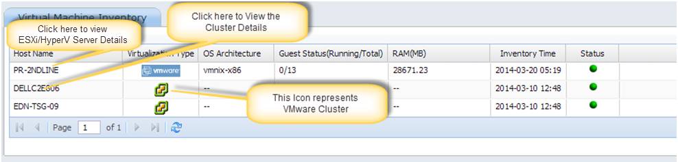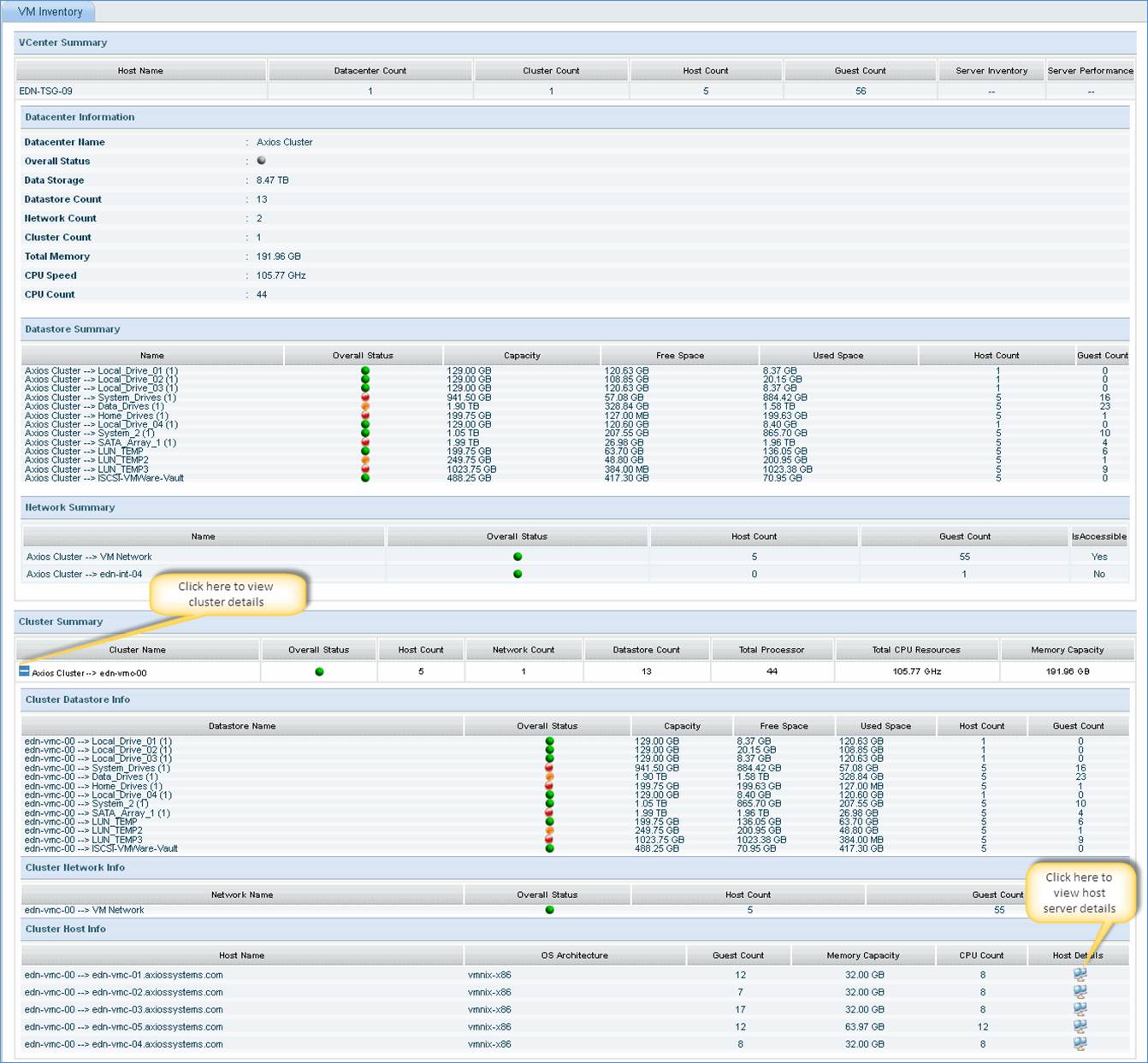 Click on a Host Name of the VMware Server Cluster to view the detailed Cluster and Virtual Machine Inventory