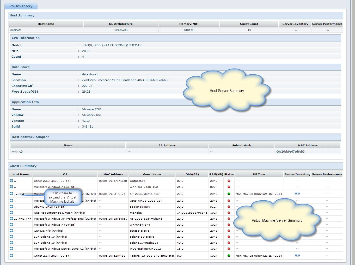 Click on a Host Name of the VMware or HyperV Server to view the detailed Virtual Machine Inventory