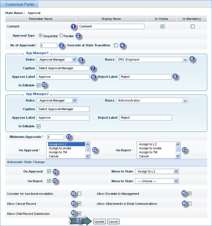 4. Select this box if you want to over write the number of approval levels mentioned in the previous step. This option allows modifying the number of approvals and the approval manager at the time of record state change