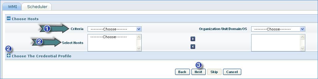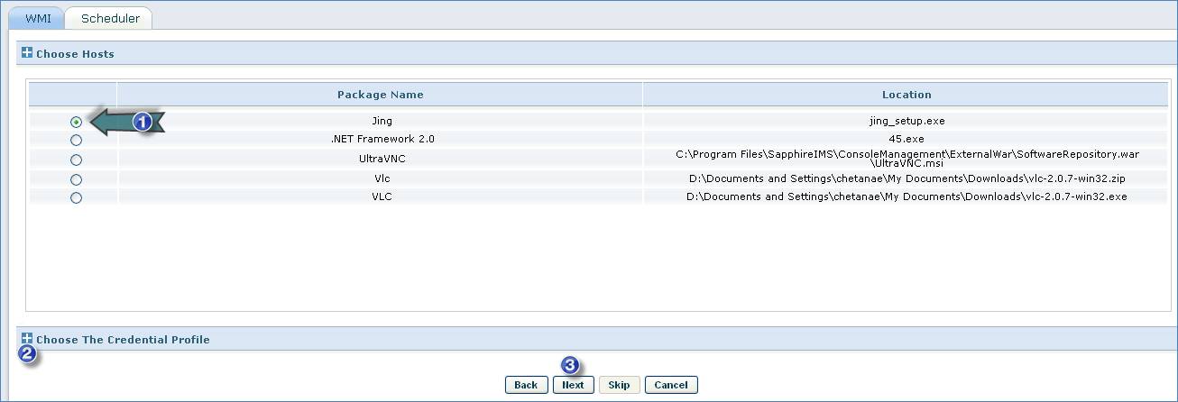 2. Select the hosts where the software package has to be installed or select the discovery credential profile if the hosts are to be discovered